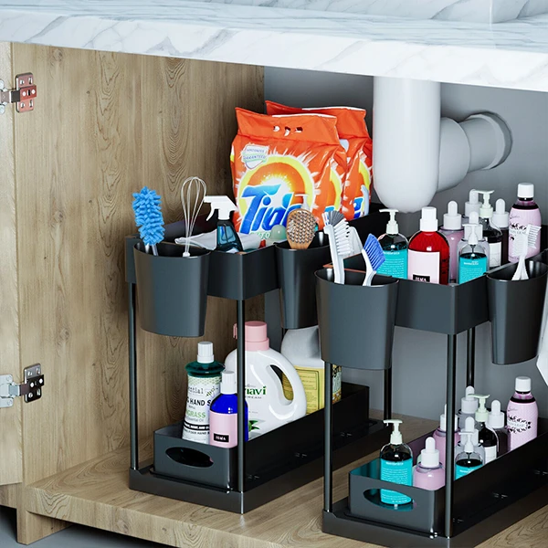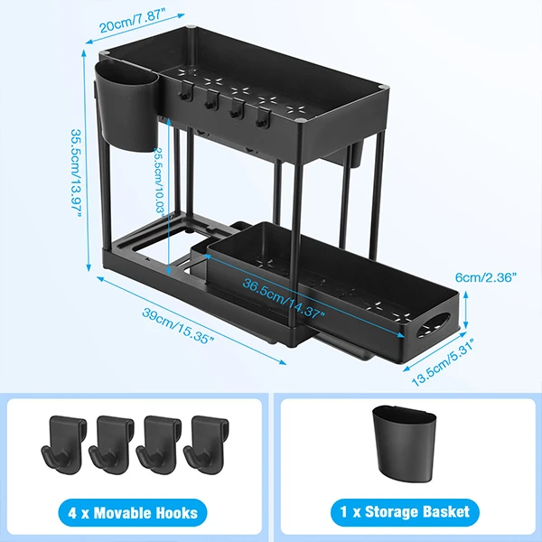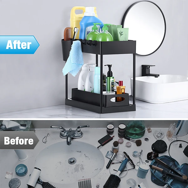 【High Quality Material】The kitchen sink cabinet organizer tray is made of high quality ABS plastic material, which is easy to install, no tools are required, and it can be assembled within 5 minutes.