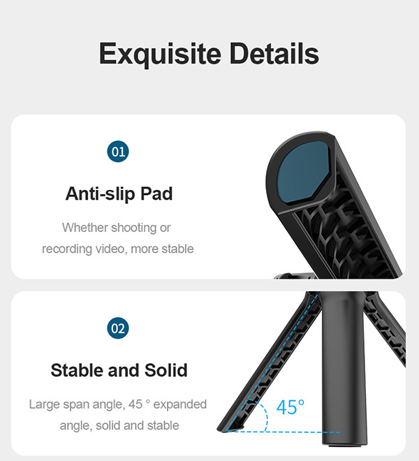 【Visible Quality and Compact Design】 The mini portable selfie stick tripod is made of PC,PA nylon and Aluminum alloy, no foul smell and waterproof, durable and stable. The handle & tripod base mount has the skid resistance of material, makes it would not slip from your hand or other surface places.