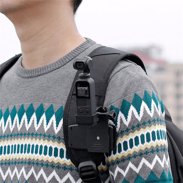 Multiple scenes use selfie stick, backpack clip, riding, tripod.