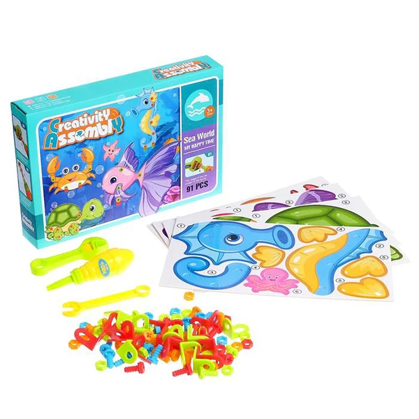 The baby's task: screw in bolts and collect pictures using playing fields and colorful figures.