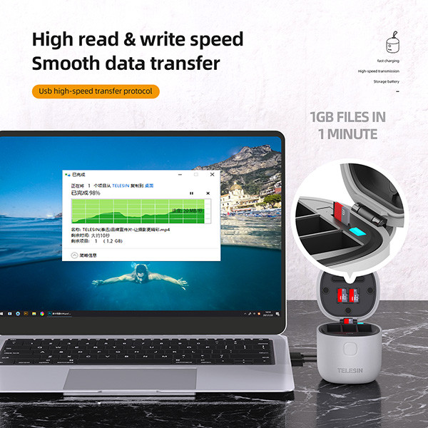 【THREE SOLUTIONS IN ONE】You can use Allin Box as CHARGER to simultaneously charge 3 GoPro Hero 9 , 10 & 11, 12 black batteries, as a high-speed SD Card Reader, and as a STORAGE BOX to store 3 batteries and 3 SD cards.