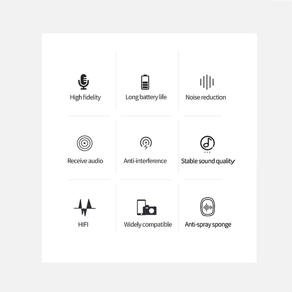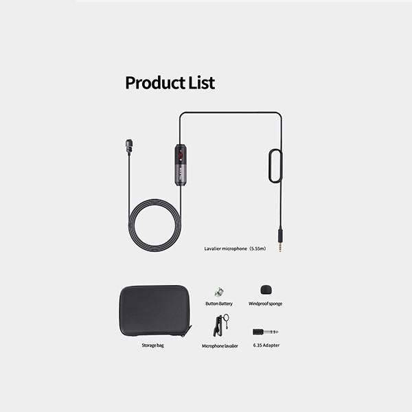 INCLUDED: 1X Lavalier Microphone (236 in cable); 1x Button Battery; 1x Adapter(3.5mm-6.5mm); 1x Metal Clip; 1x Wind Muff; 1x Manual; 1x Bag.
