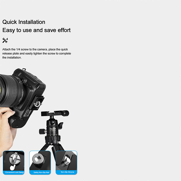* Quick installation, easy to use and save effort, attach the 1/4 screw to the camera, place the quick release plate and easily tighten the screw to complete the installation.