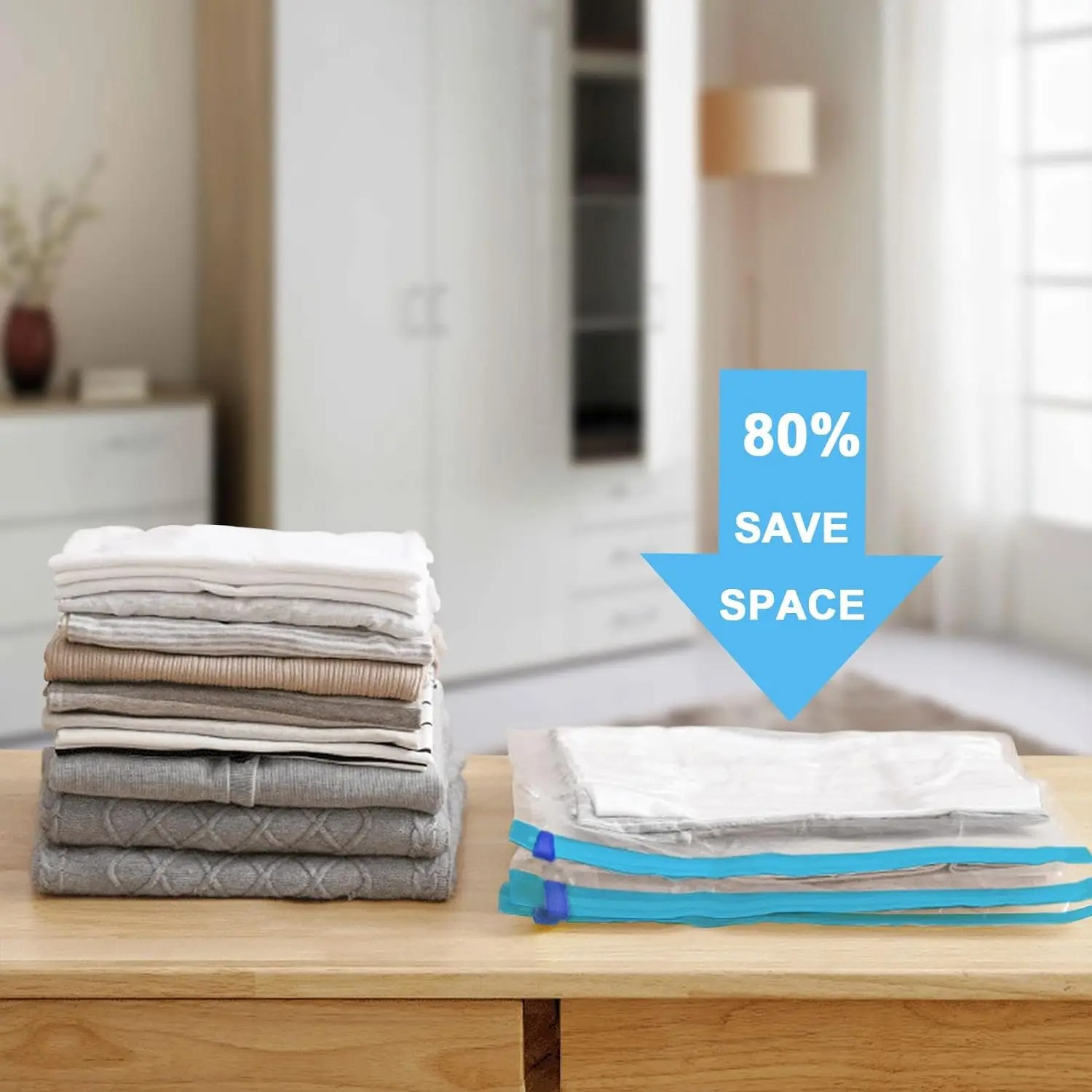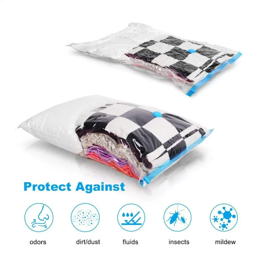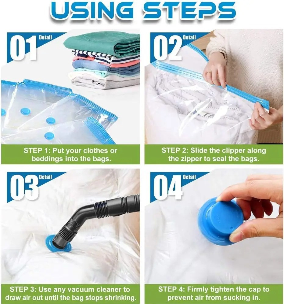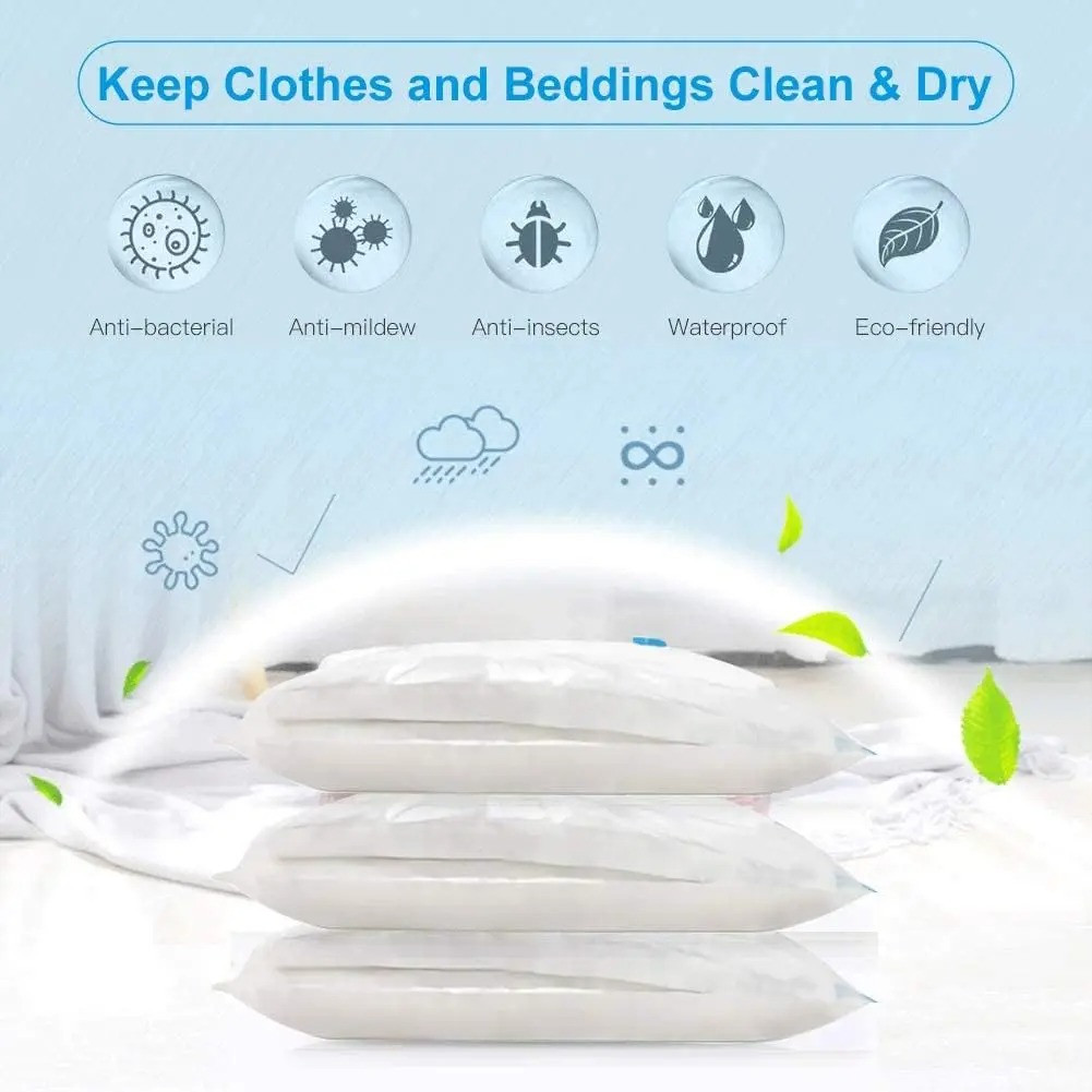 • STORAGE BAGS: Vacuum compression space-saver bags for storing large items such as duvets, bed sheets, blankets, pillows, drapery, and more