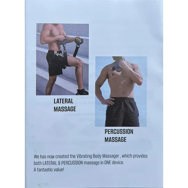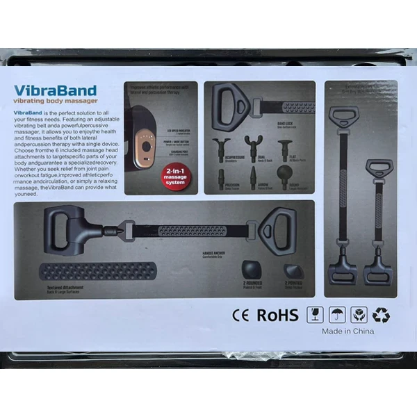 VibraBand Vibrating Body Massager SL-888 VibraBand is the perfect solution to all your fitness needs. Featuring an adjustable vibrating belt and powerfulpercussive massager, it allows you to enjoythe health and fitness benefits of both lateral andpercussion therapy with single device.